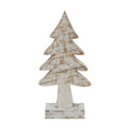 Distressed Wooden Tree is a tabletop tree made for winter decor! The tree has a rustic charm due to its weathered finish, and it is made of lightweight and durable wood. The tree is freestanding, allowing for easy display on a holiday mantel or shelf. Measures 8" high by 2.75" wide