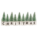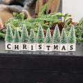 Celebrate the holiday with a forest of mini Christmas trees with the Winter Sparkle Forest Christmas Block Sitter. This darling sitter consists of attached wooden blocks in white with rusty-looking distressing at the edges. Each block displays one letter of the word 'Christmas' and is topped with a green bottle brush pine tree. The trees vary in height and are dusted with white for a wintry feel. The piece measures 4.5" high by 11.5" wide by 1" deep. This sitter looks great in a variety of displays. Hang a pretty sign reading 'Merry' on the wall above a shelf or table and place this cute sitter below for a unique 'Merry Christmas!'